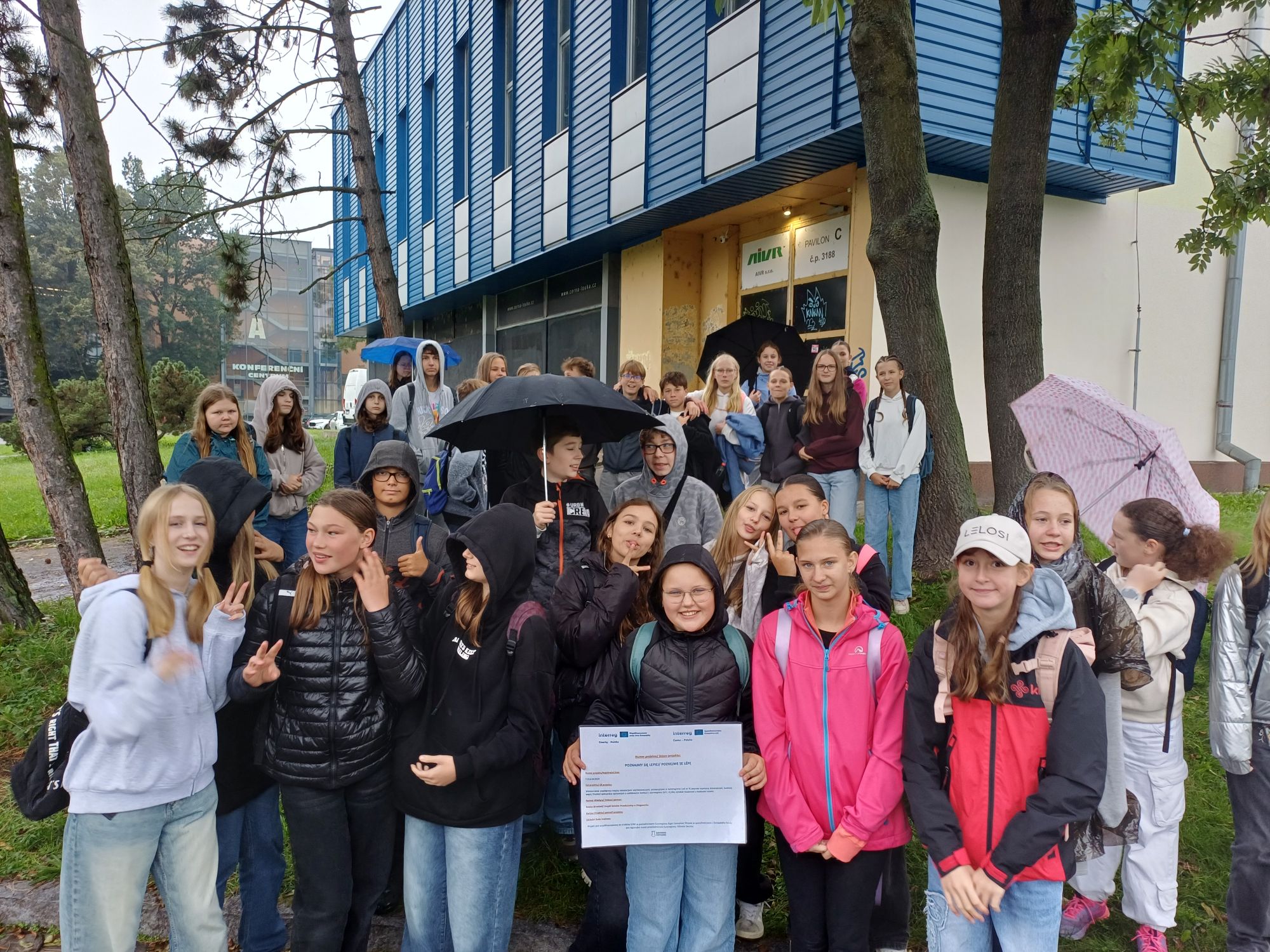 Dnes 3. 6. 2025 je deštivo, zamračeno, ale my se přesto těšíme na výlet. Čeká nás totiž společná akce s žáky z partnerské školy v Drogomyśli.