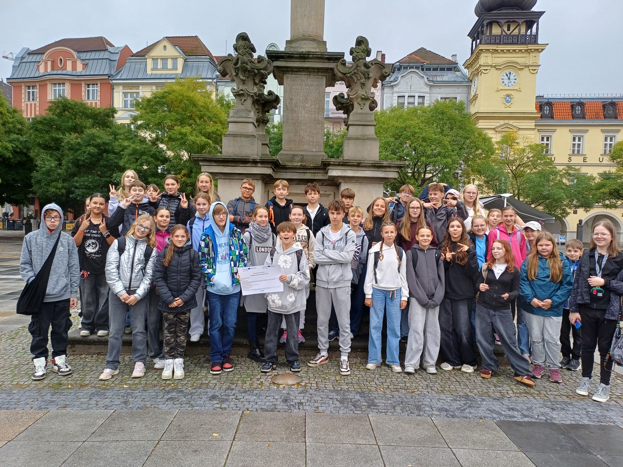 Již několikaleté partnerství s polskou školou v Drogomyśli se opět zúročilo. V rámci projektu Poznajmy się lepie se žáci sedmých tříd jedno deštivé úterý (23. 9. 2025) setkali s podobně starými žáky z Polska. Byli jsme od nich pozváni na procházku Ostravou. Paní průvodkyně nás vedla za nejzajímavějšími památkami v centru Ostravy, kde nejprve polsky a poté i česky mluvila o staleté významné historii. Cestou jsme tedy mohli obdivovat nejstarší budovu ve městě, projít se po nábřeží doprovázeni historií mostu Miloše Sýkory a uzavřít procházku na Masarykové náměstí. Žáci se také dostali až na věž Nové radnice, kde mohli spatřit město, i když jim pošmourné počasí nedovolilo dohlédnout až do Beskyd, které jsou z tohoto vyvýšeného místa za slunečného počasí krásně vidět.