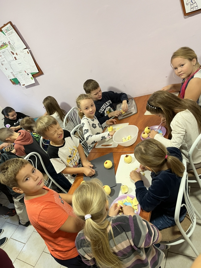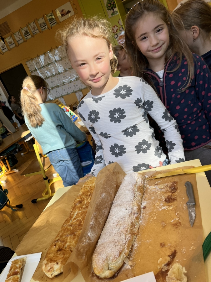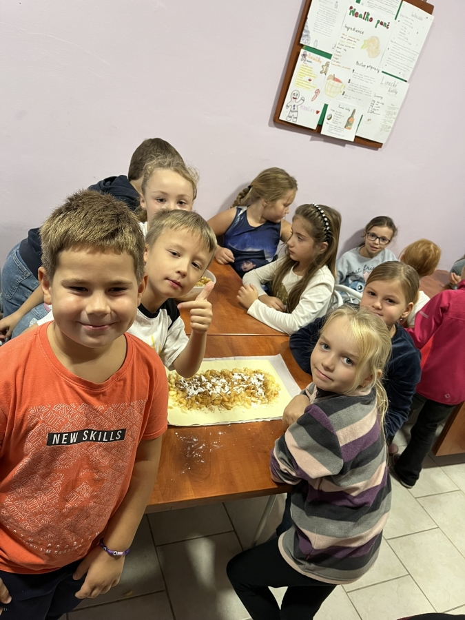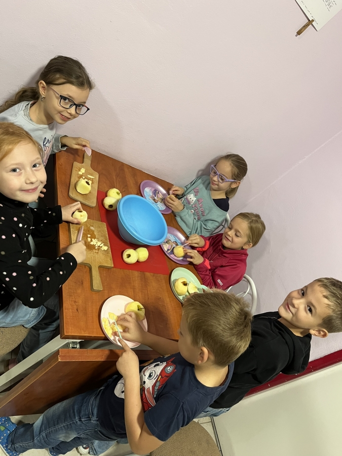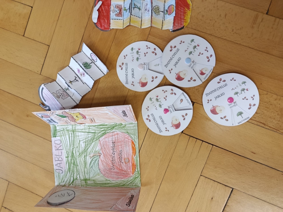 Po návratu do školy jsme se k tématu vrátili – povídali jsme si o stromech, o tom, proč jsou pro nás tak důležité, udělali jsme si voňavý jablečný štrůdl, vytvořili jabloňový koloběh od semínka po plod, vyráběli lapbook a pořídili si krásné podzimní fotky s jablíčkem. Byl to den plný objevování, radosti a společných zážitků.