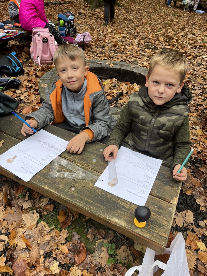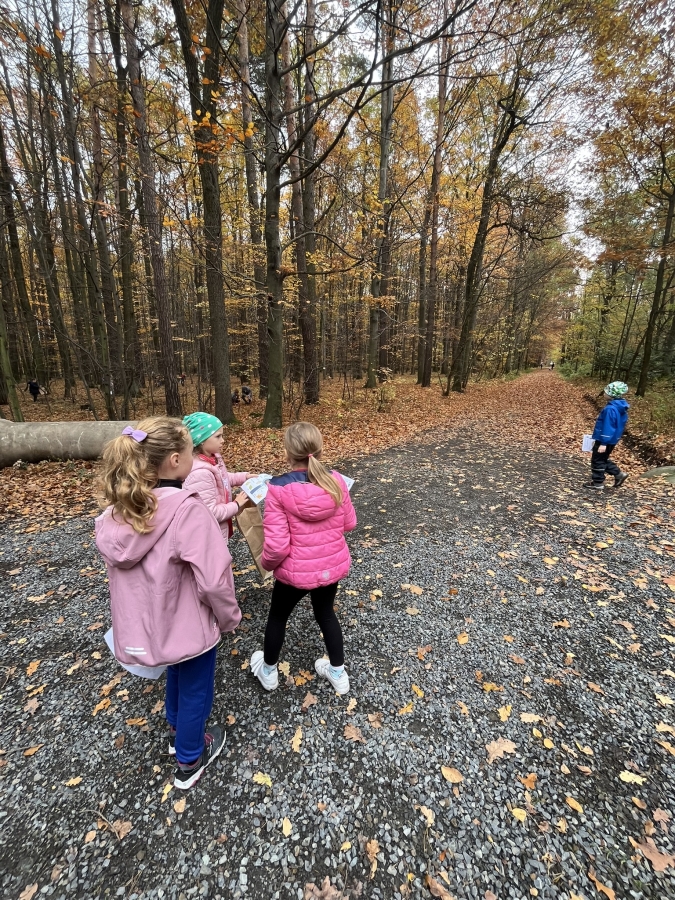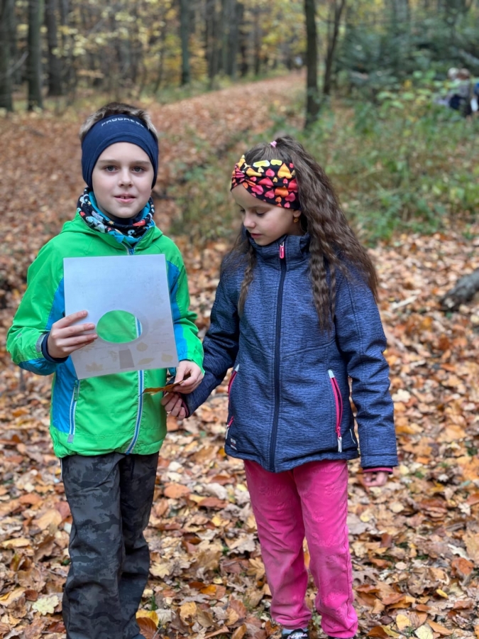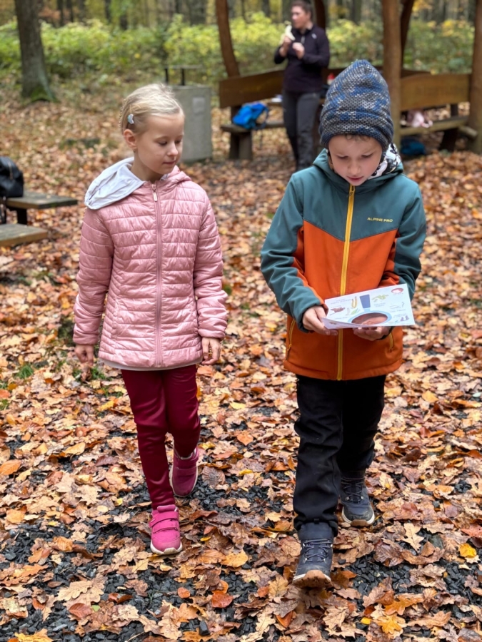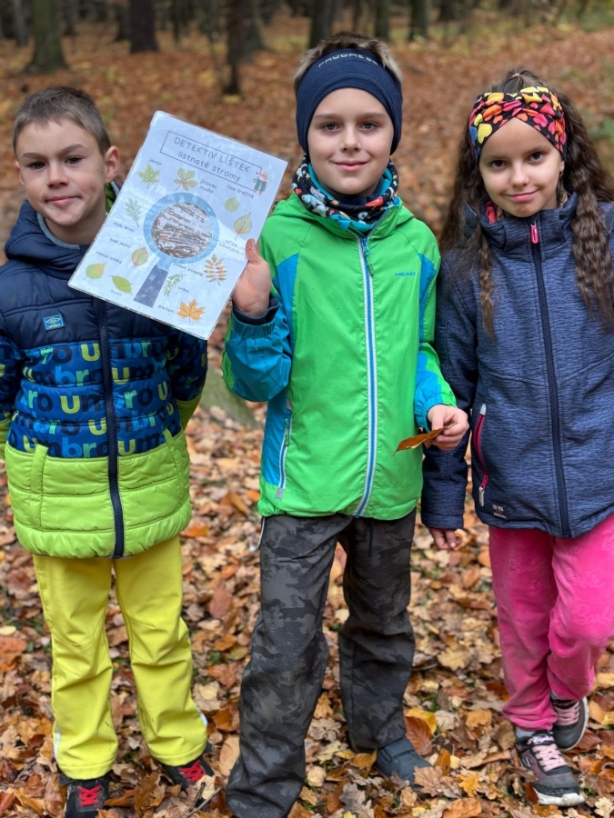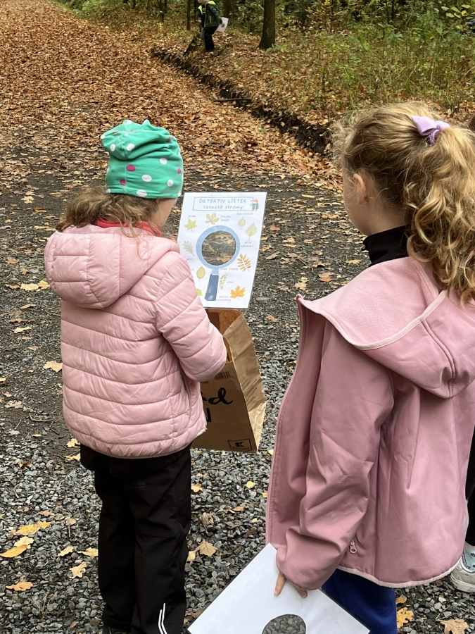 S badatelským listem a lupou jsme objevovali podzimní tajemství – zkoumali listy, plody, kůru stromů i drobné detaily, které člověk ve spěchu snadno přehlédne. Sbírali jsme lístky všech možných tvarů a barev, poznávali stromy kolem sebe a radovali se z toho, co všechno příroda ukazuje, když jí dáme čas.