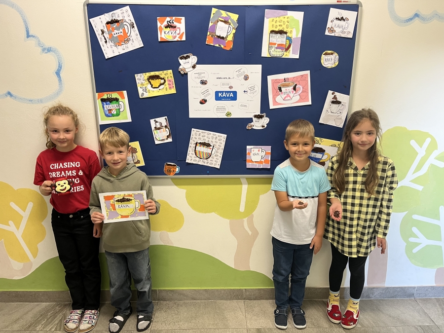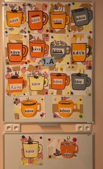 A naši prvňáci? Ti projekt krásně vyzdobili svým výtvarným nadáním. Připravili koláže s hrníčkem a nápisem KÁVA, které celý projekt ozdobily a ukázaly, že i nejmladší mohou přispět svou kreativitou.