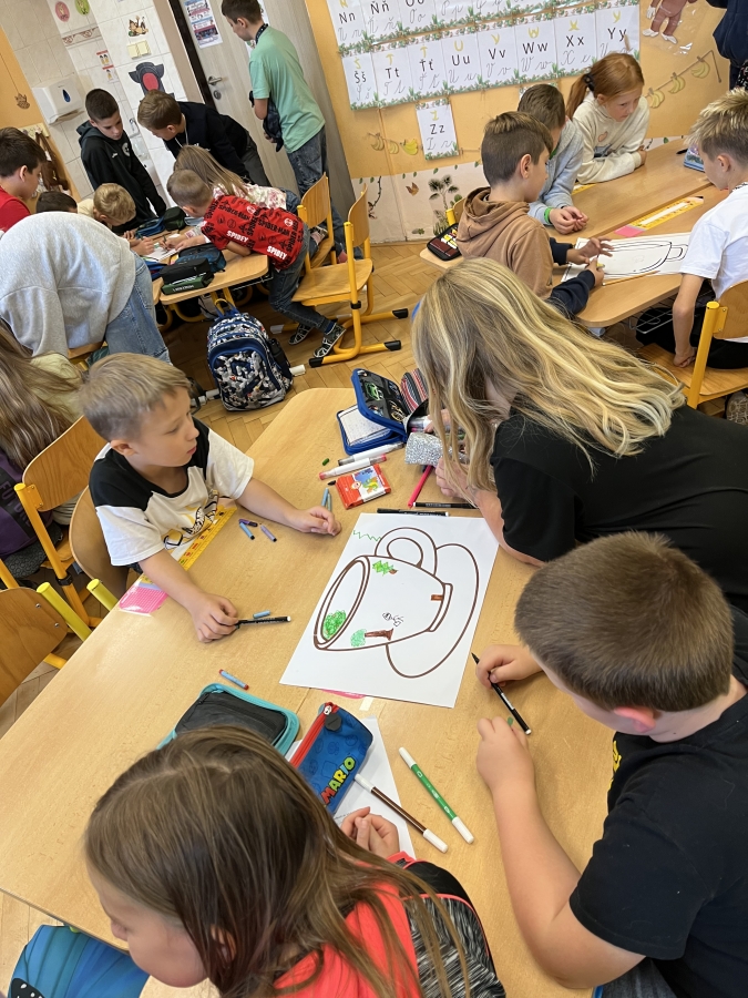 Nejkrásnější byla spolupráce mezi třídami. Páťáci se stali učiteli a pomáhali druhákům při čtení textu a tvorbě EKO plakátu. Do hrnku jsme společně psali a kreslili nápady, jak šetřit přírodu: recyklovat, šetřit vodou, sázet stromy, vážit si jídla. Druháci přicházeli se skvělými nápady a ukázali, že i oni mohou být ekologičtí hrdinové.