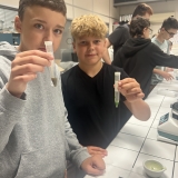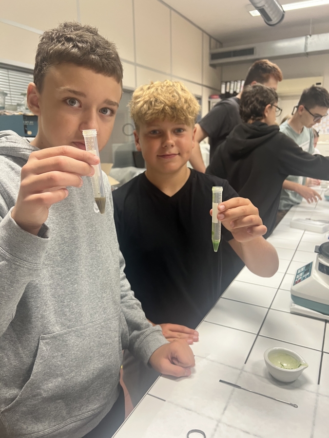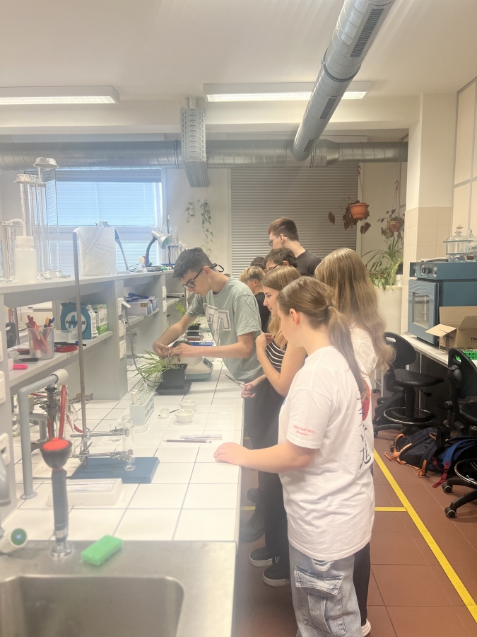 Jako první jsme se zabývali přírodopisem. Mohli jsme si zkusit mikroskopy a vidět různé preparáty, např. lotos, žabí krev, krystaly, lidský vlas, tabák a trepky. Následně jsme měli zeměpis. Zabývali jsme se řekami. Pozorovali jsme ekosystém ve vodě, kde jsme našli hrotnatku a její mládě, dokonce jsme vytvořili umělou maketu řeky, kde protékala voda. Byl to skvělý zážitek. V této sekci nás čekal také kvíz, otázky směřovaly na témata jako jsou části řeky, změna tvaru řeky, filtrace a čištění vody, ochrana proti povodním, tvorové žijící ve vodě. Následovala biofyzika, kde jsme vyráběli barvivo z ječmene a lístků květin. Tekutina byla nanesena na papírek a to celé vloženo do směsi. Po vytáhnutí ze zkumavky se papírek krásně zabarvil. Při čekání na výsledek proběhla přednáška o UV-záření. K tomu jsme měli za úkol UV-baterkou nakreslit věci nebo slova, která jsme za tu hodinu slyšeli.