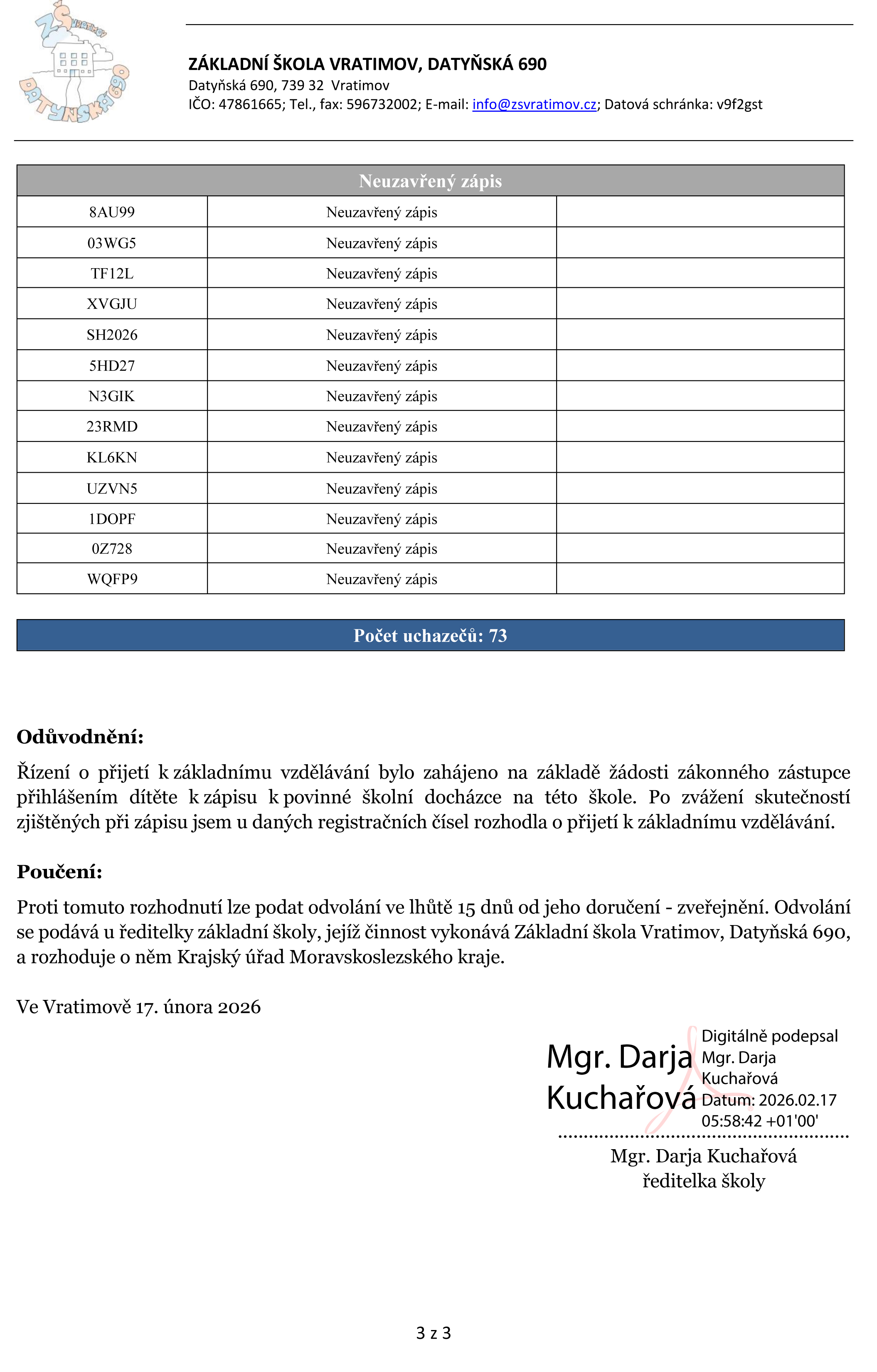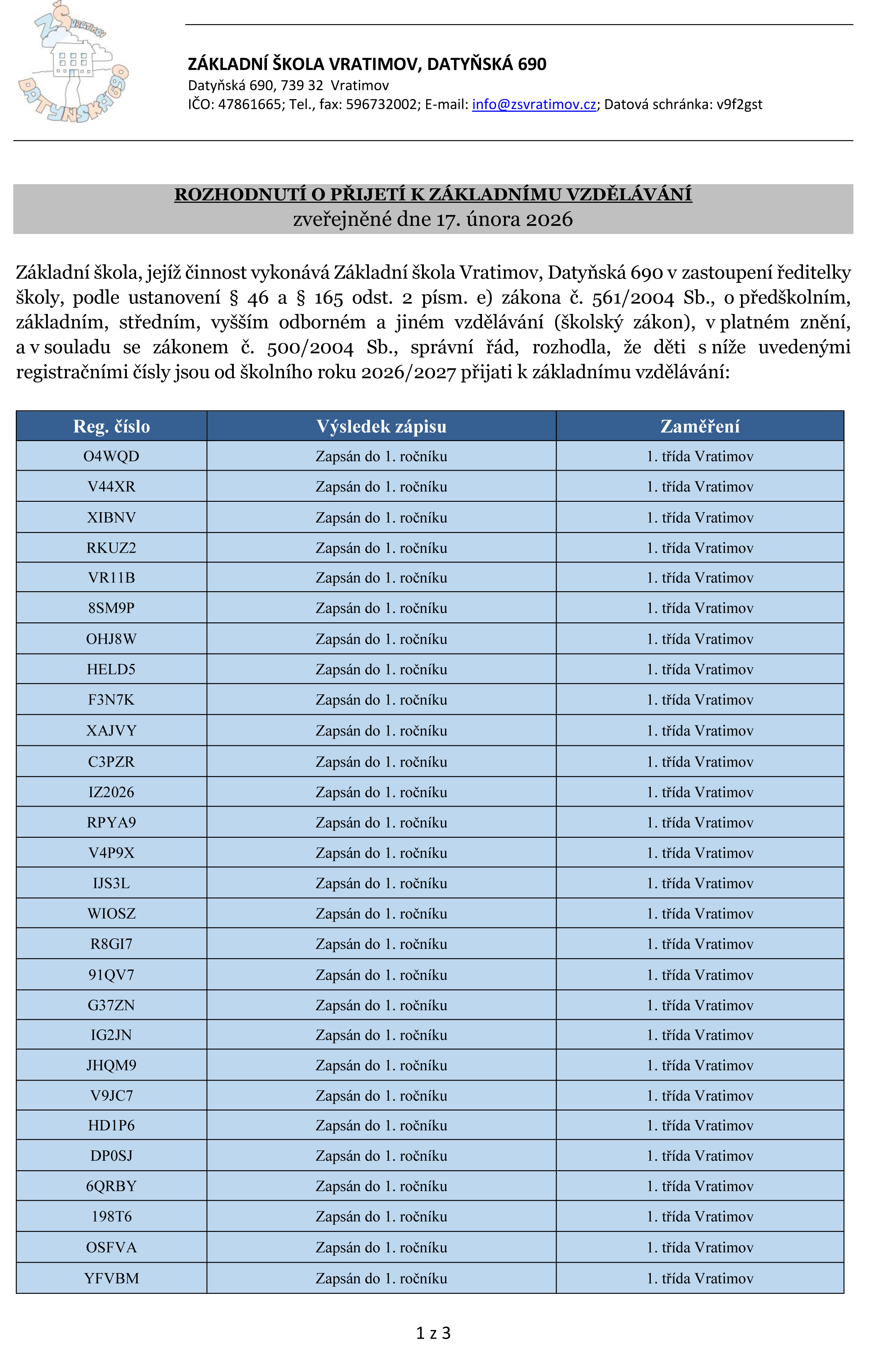 Výsledky zápisu - rozhodnutí o přijetí k základnímu vzdělávání 2026/2027